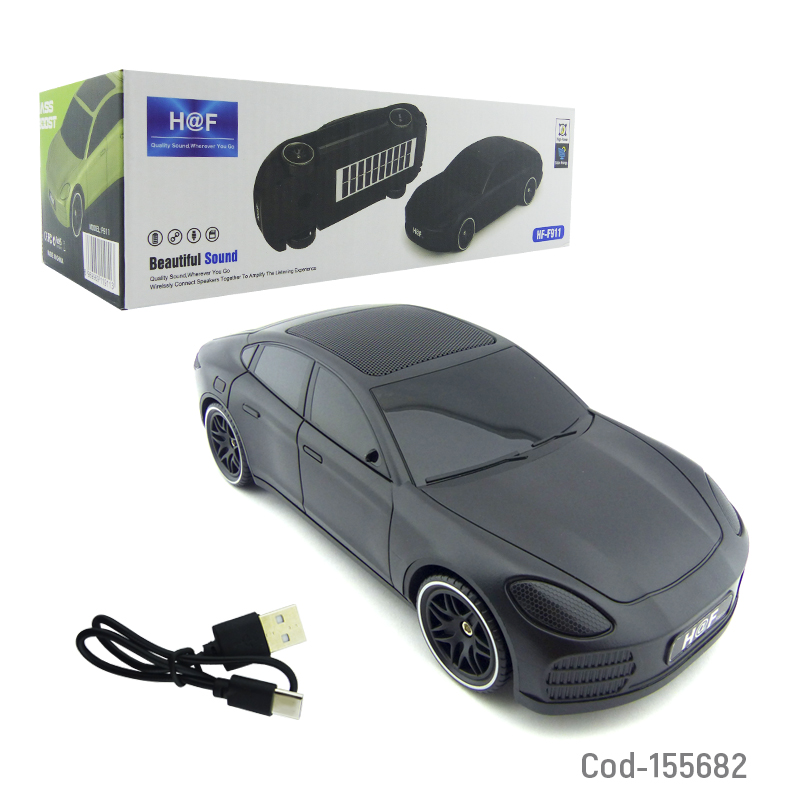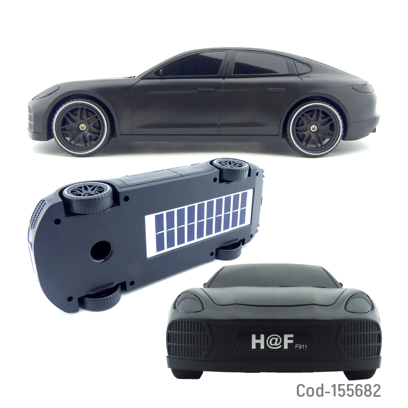 Parlante recargable HF-F911 en forma de auto Porsche. Con conectividad Bluetooth, panel solar y múltiples opciones de conexión como USB, TF, FM y DC, es perfecto para cualquier ocasión. Disponible en una variedad de colores, combina estilo y funcionalidad en un solo dispositivo. Producto en caja.
