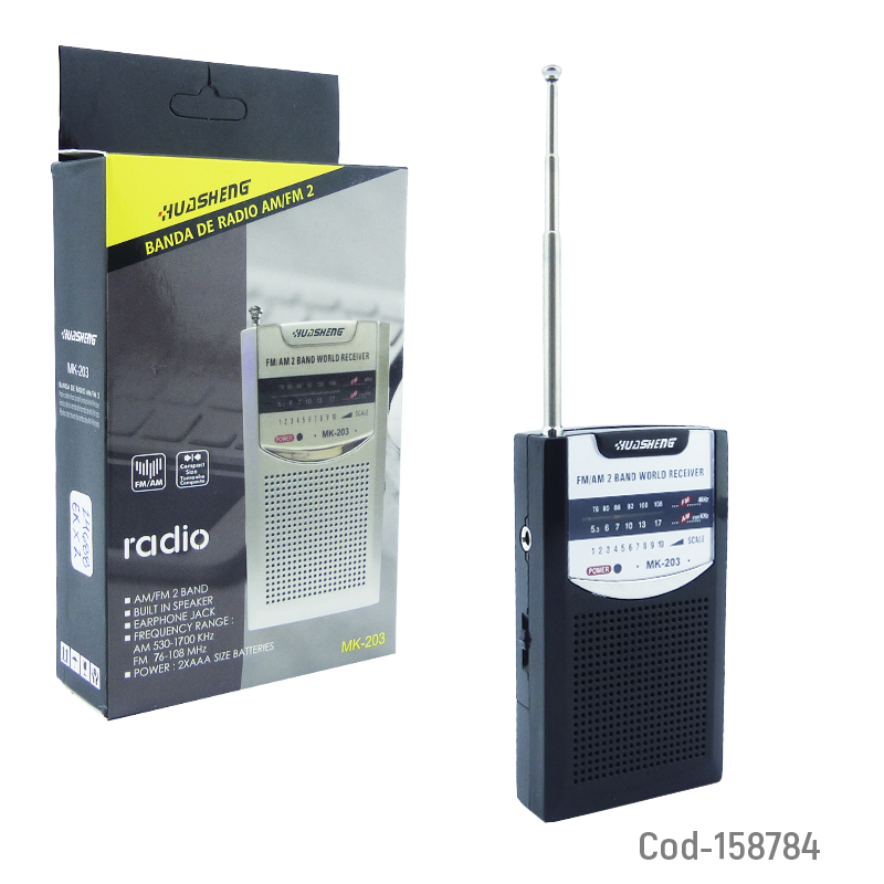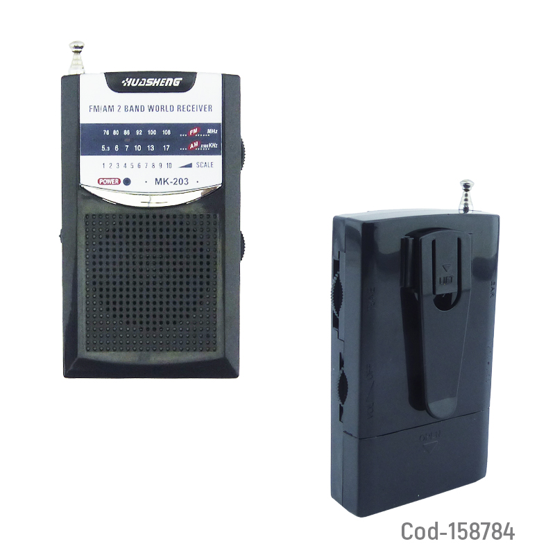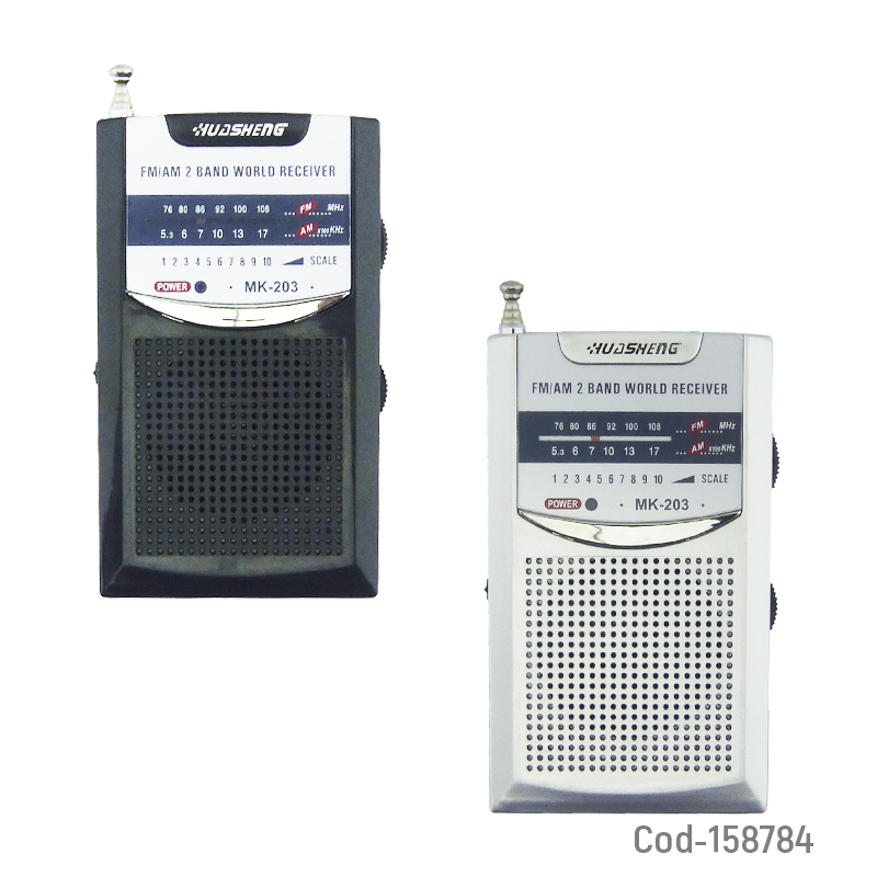 Radio AM/FM 2 bandas marca HUDSHENG modelo MK-203 a pilas en dos colores: práctica y portátil, esta radio funciona con pilas y sintoniza con facilidad las bandas AM y FM, disponible en dos colores clásicos, ideal para uso diario, viajes o emergencias donde se requiera información o entretenimiento sin depender de la electricidad. Producto en caja.