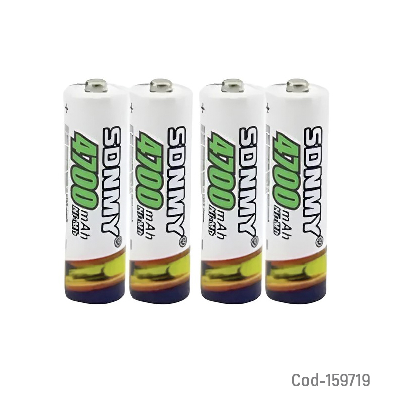 Pila marca SDNMY AA set x 4 de 1.2 volt recargable a 4700 mAh, incluye estuche PVC para almacenamiento seguro y se presenta en blíster, ofreciendo gran capacidad y rendimiento para dispositivos de alto consumo como cámaras, juguetes o controles.