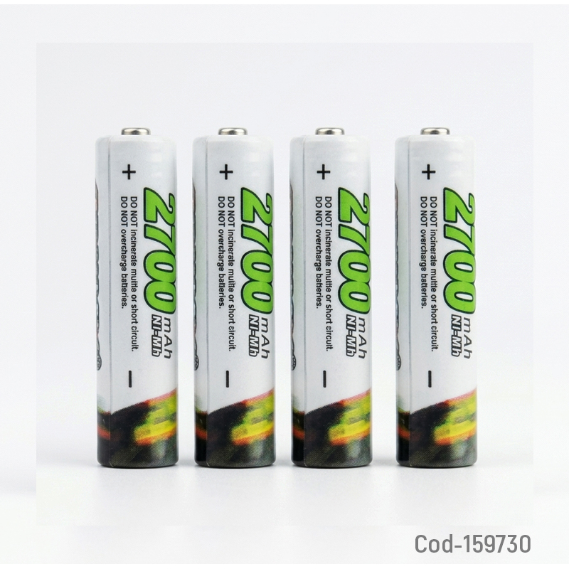 Pila marca SDNMY AAA set x 4, de 1.2 volt recargable a 2700 mAh, incluye estuche PVC para almacenamiento seguro y se presenta en blíster, ofreciendo gran capacidad y rendimiento para dispositivos de alto consumo como cámaras, juguetes o controles.