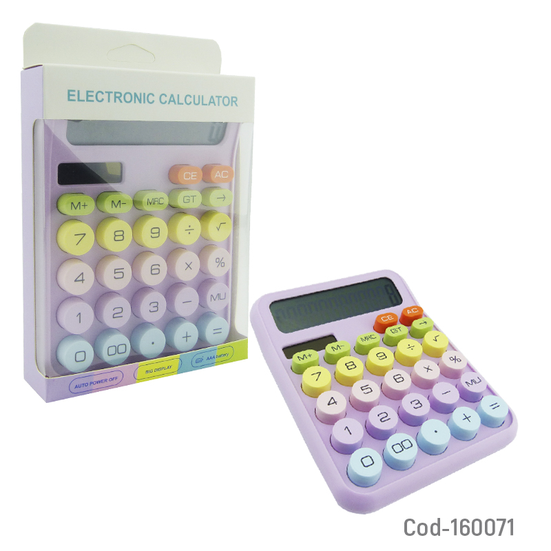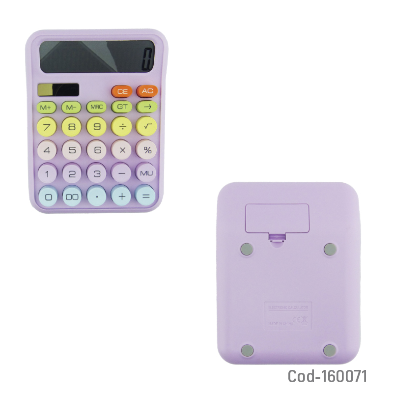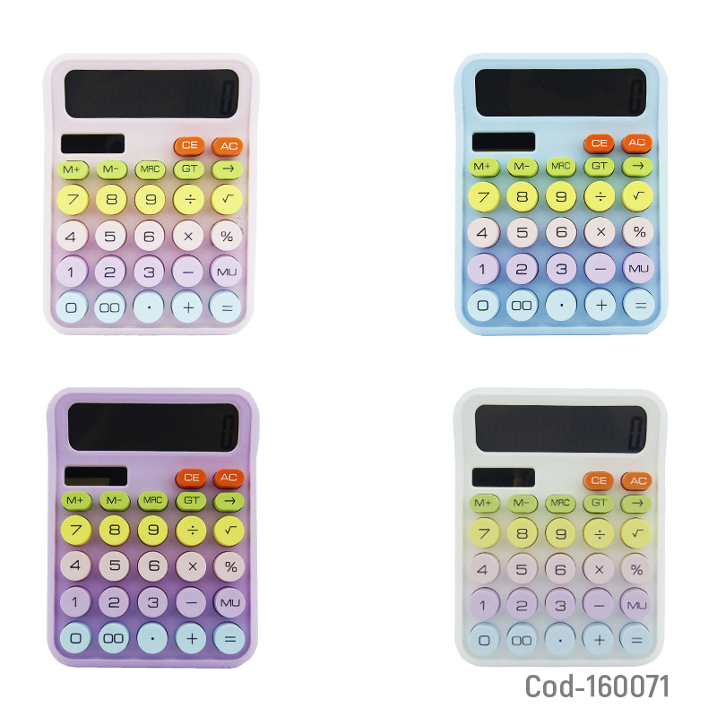 Calculadora de 12 dígitos a pilas (no incluidas) y luz, en variedad de colores. Diseño compacto y funcional para uso escolar o de oficina. Producto en caja.