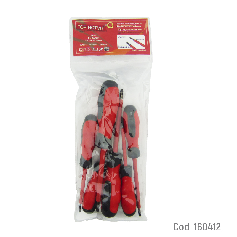 Destornillador set x 6 piezas marca TOP NOTVH, incluye puntas planas y cruz, ideal para trabajos eléctricos y de precisión. Diseño ergonómico para mayor comodidad y control. Producto en bolsa.