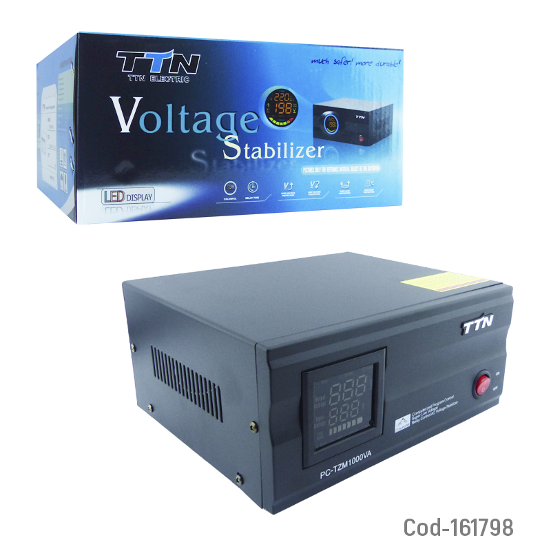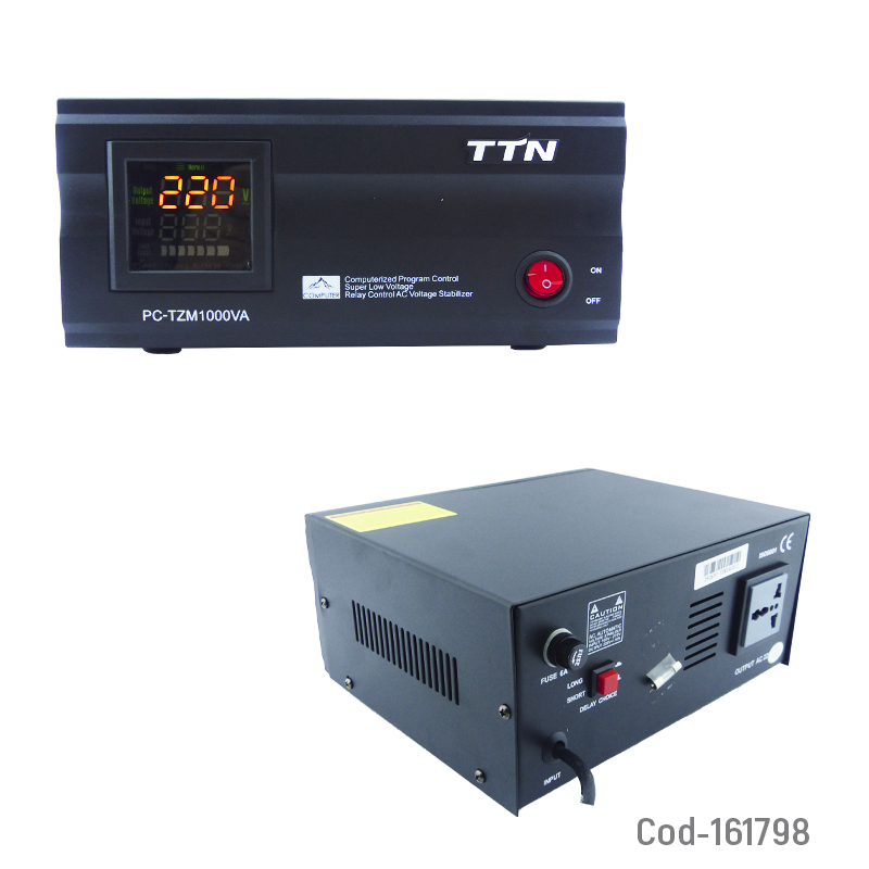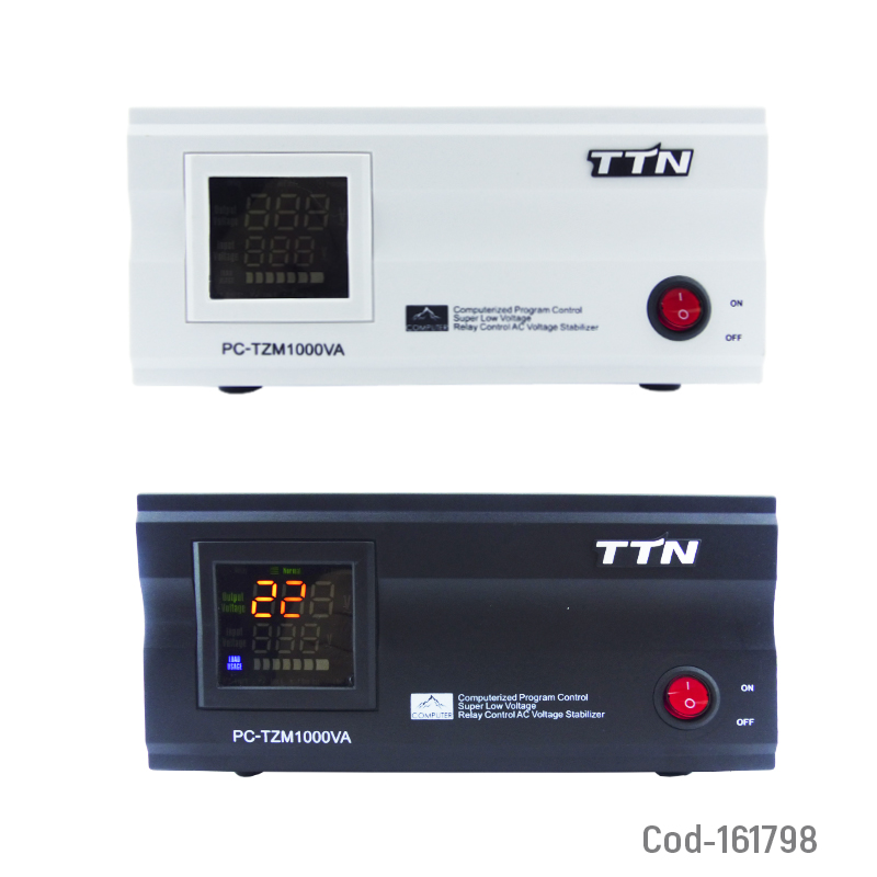 Estabilizador o regulador de voltaje marca TTN, modelo 2000VA (900 Watt), disponible en dos colores. Protege equipos eléctricos contra fluctuaciones de voltaje, asegurando funcionamiento seguro y estable en el hogar o negocio. Producto en caja.