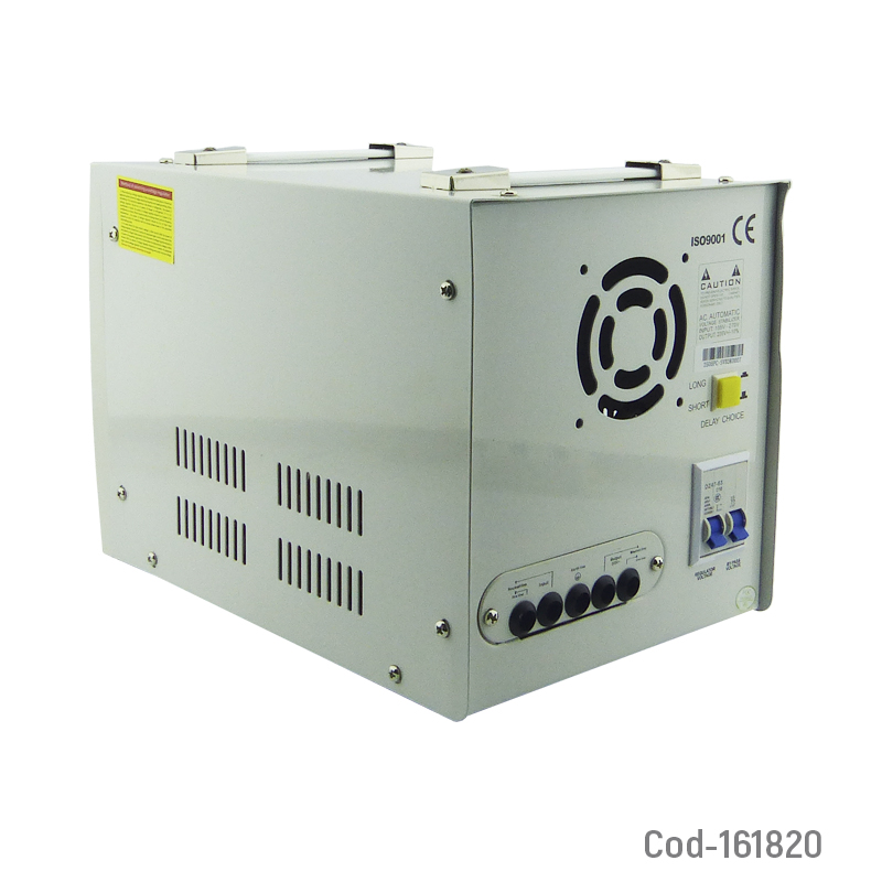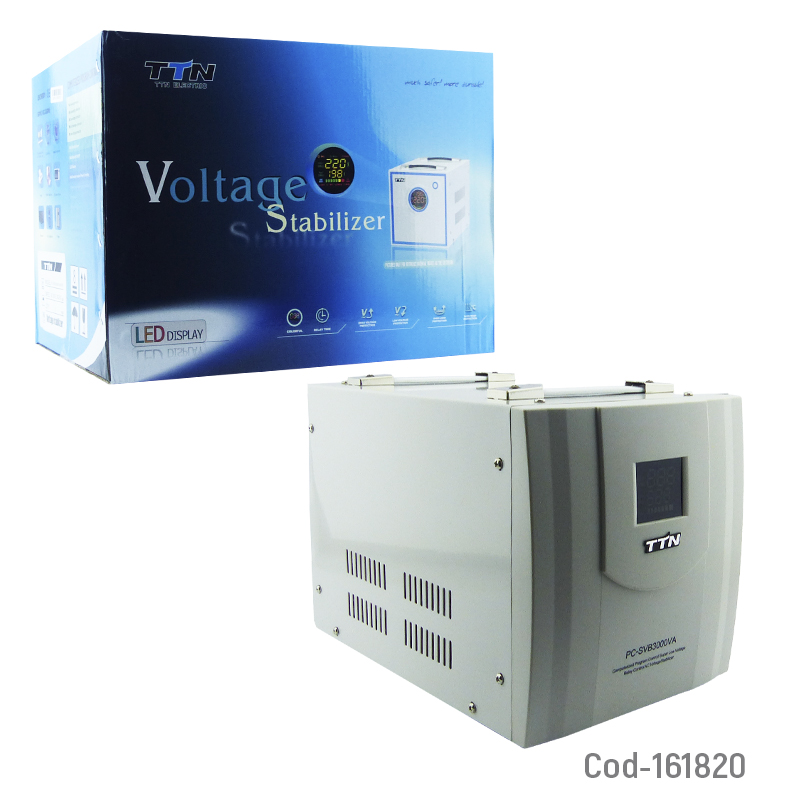 Estabilizador o regulador de voltaje marca TTN, modelo 3000VA (2100 Watt), disponible en dos colores. Protege equipos eléctricos contra fluctuaciones de voltaje, asegurando funcionamiento seguro y estable en el hogar o negocio. Producto en caja.