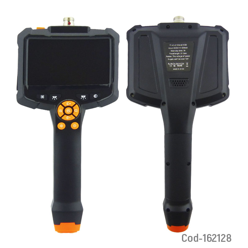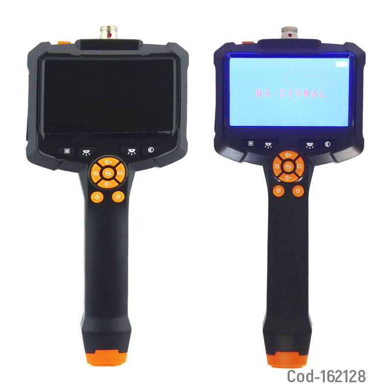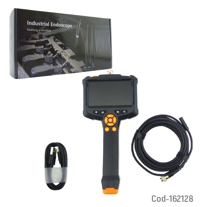 Cámara endoscópica con pantalla de 4.3 pulgadas, cable de 5 metros y 8 LED, ideal para inspecciones en trabajos mecánicos y de mantenimiento. Permite visualizar áreas de difícil acceso con claridad, producto en caja.