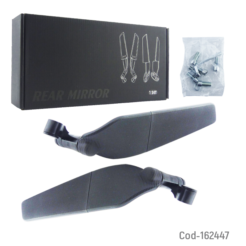 Espejo para moto modelo RACE largo de hilo 8-10 mm, el par. Ideal para reemplazar espejos estándar de tu moto, ofreciendo instalación rápida y ajuste seguro. Perfecto para quienes buscan un accesorio resistente y funcional para uso diario o deportivo. Producto en caja.
