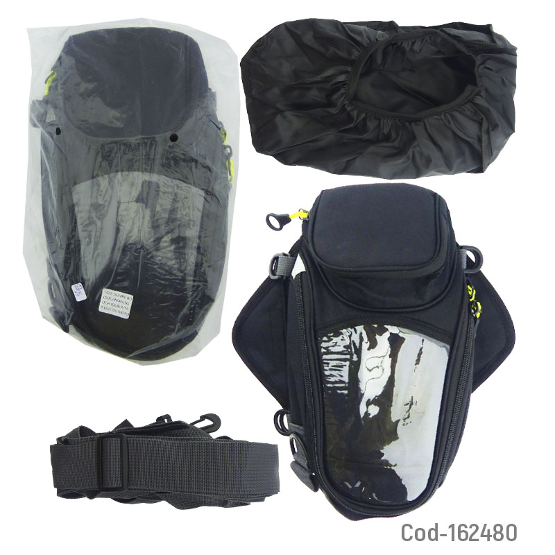 Maleta para tanque de moto con imán y porta smartphone touch, práctica y resistente. Facilita el transporte de objetos personales y permite utilizar el teléfono de manera segura durante el viaje, producto en bolsa.