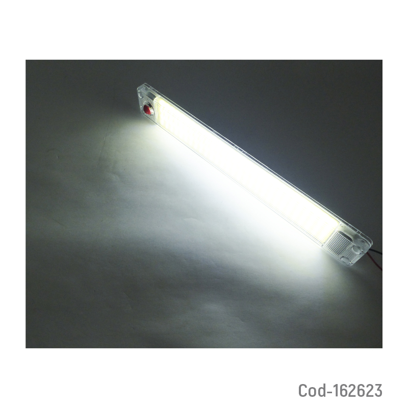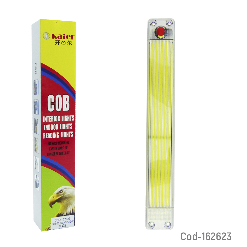 Luz de techo LED COB, compatible con sistemas de 12 y 24 voltios, que ofrece iluminación blanca potente y uniforme. Ideal para interiores de autos, camiones o espacios reducidos, con bajo consumo energético y larga durabilidad. Producto presentado en caja.