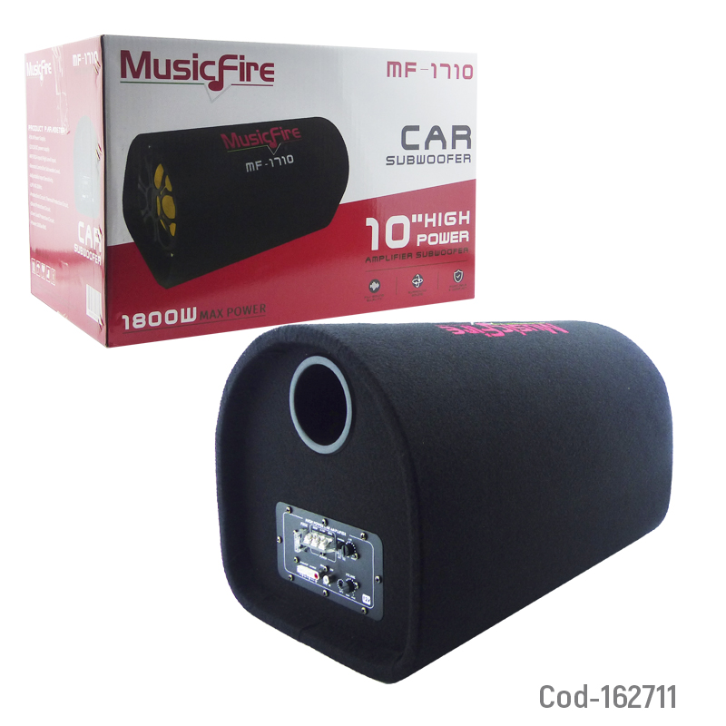 Bazooka de 10 pulgadas a 12 V, marca MUSIC FIRE, modelo MF-1710, con potencia de 1800 W. Diseñada para ofrecer graves profundos y sonido de alta calidad, ideal para sistemas de audio automotriz, producto en caja.