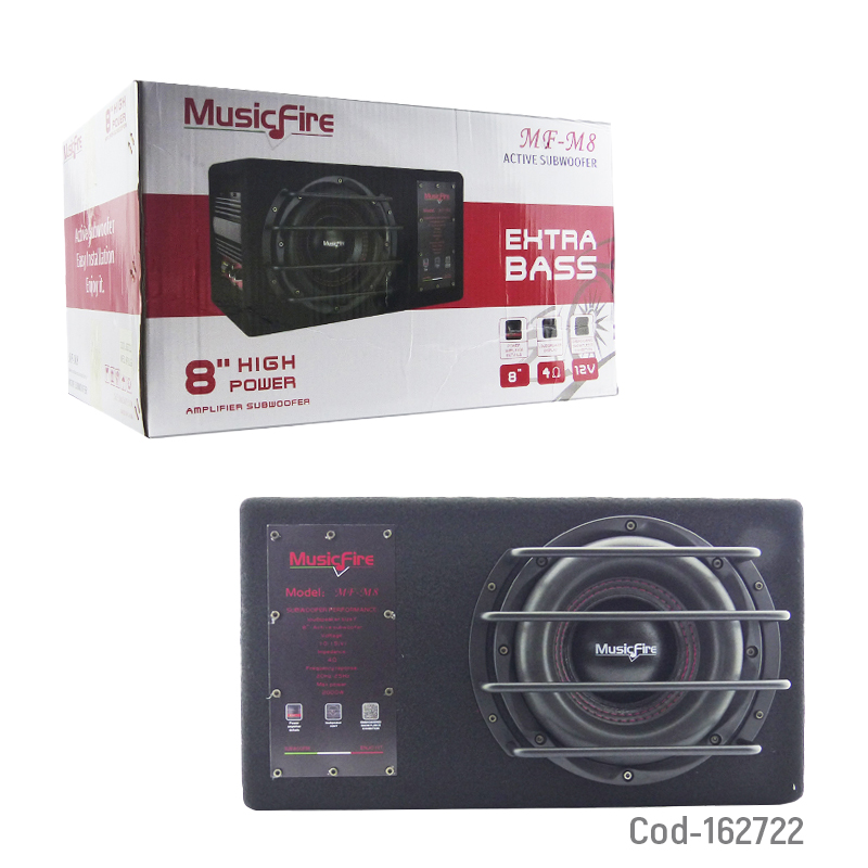 Subwoofer amplificado para auto de 8 pulgadas, marca MUSIC FIRE, modelo MF-8, con potencia de 2000 Watt. Ofrece graves potentes y sonido de alta fidelidad, ideal para mejorar el audio automotriz, producto en caja.