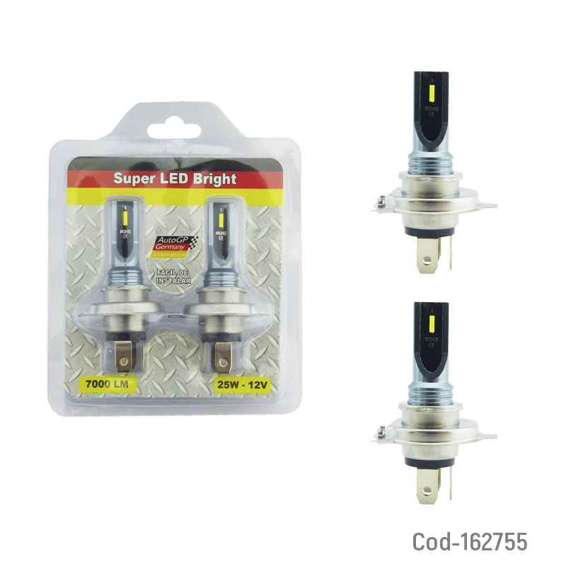 Kit de ampolletas LED H-4 marca AUTOGP, de 25 W y 7000 lúmenes, compatible con sistemas de 12 y 24 voltios. Proporciona iluminación potente y uniforme, ideal para mejorar la visibilidad en carretera. Producto presentado en blíster.