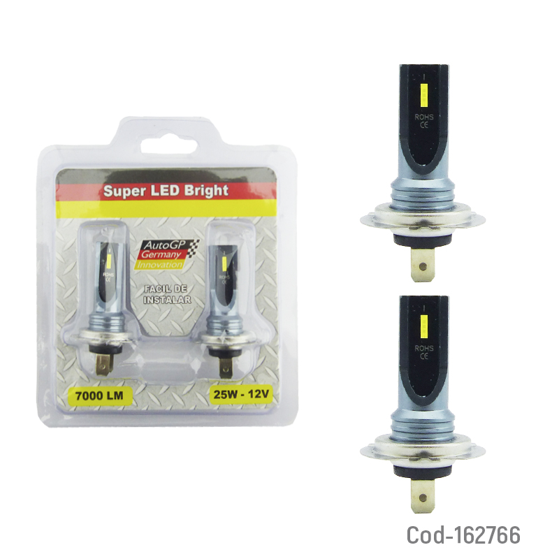 Kit de ampolletas LED H-7 marca AUTOGP, de 25 W y 7000 lúmenes, compatible con sistemas de 12 y 24 voltios. Proporciona iluminación potente y uniforme, ideal para mejorar la visibilidad en carretera. Producto presentado en blíster.