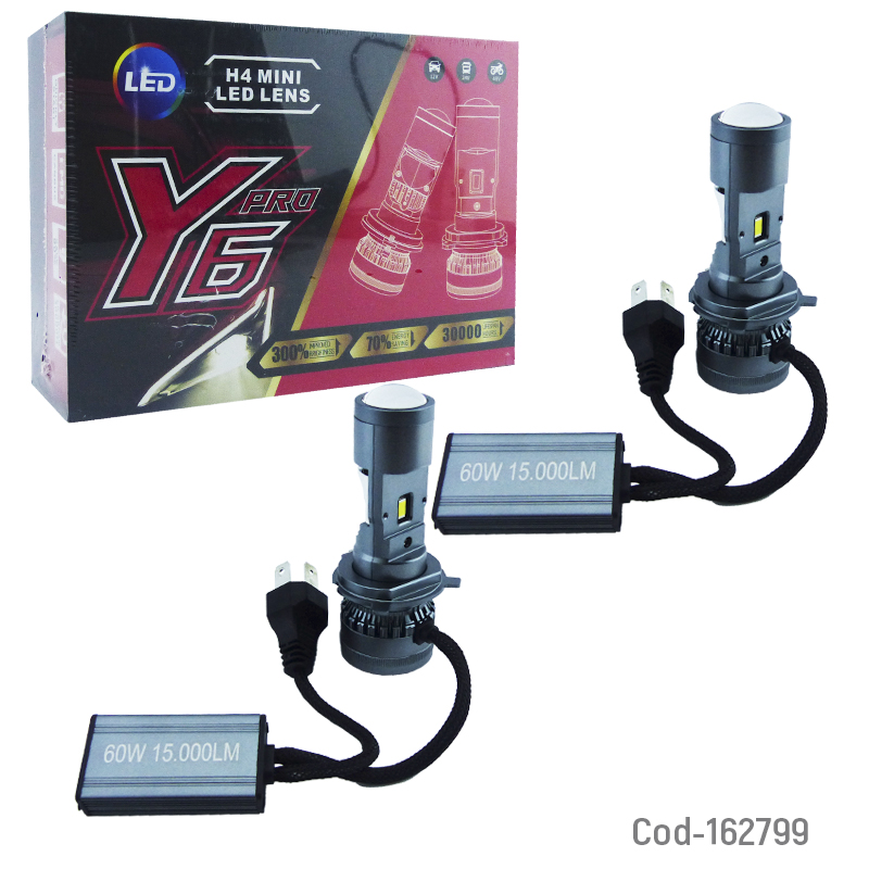 Ampolleta Kit LED H-4 modelo Y6PRO MINI de 60 watt a 15000 lúmenes con ventilación, el par. Ideal para reemplazar luces halógenas estándar, ofreciendo mayor luminosidad y durabilidad en tu vehículo. Producto en caja.