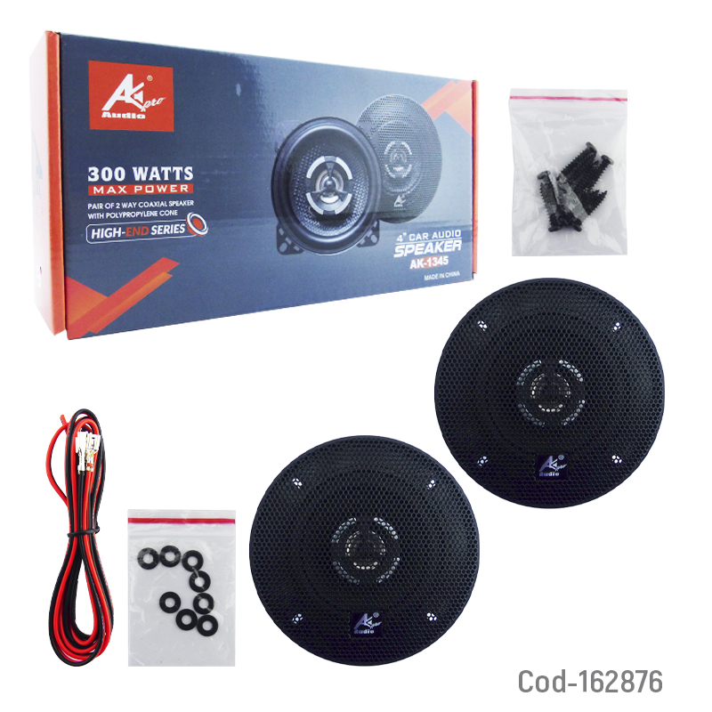 Parlante para auto marca AK-PRO, modelo AK-1345, de 4 pulgadas y 300 Watt el par. Ofrece sonido potente y claro, ideal para mejorar el audio dentro del vehículo. Producto presentado en caja.