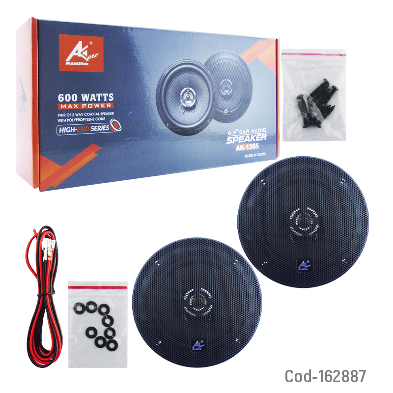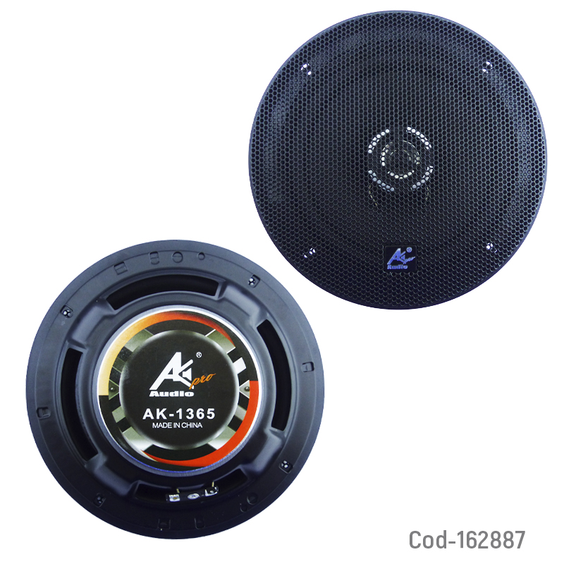 Parlante para auto marca AK-PRO, modelo AK-1365, de 6.5 pulgadas y 600 Watt el par. Ofrece sonido potente y claro, ideal para mejorar el audio dentro del vehículo. Producto presentado en caja.