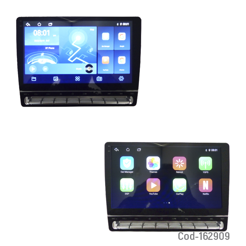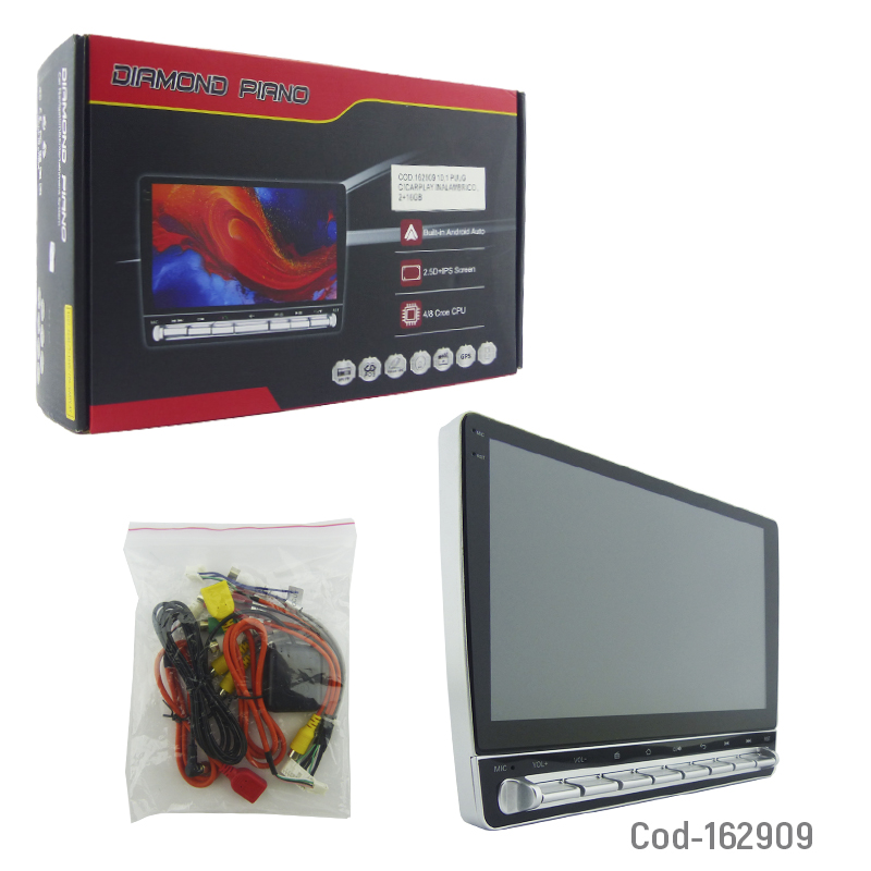 Radio para auto con pantalla de 10.1 pulgadas, modelo NEW, compatible con CarPlay y Android, pantalla táctil y botones físicos. Ofrece conectividad avanzada, reproducción multimedia y control fácil desde el vehículo, producto en caja.