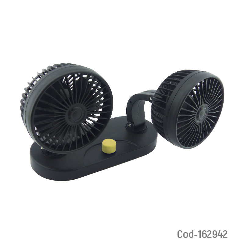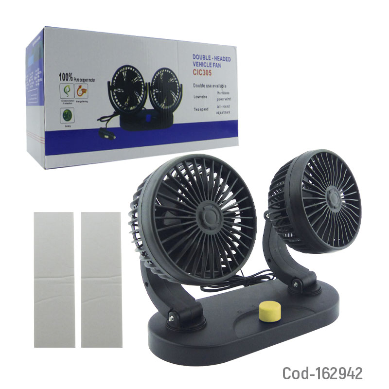 Ventilador doble en PVC de 4 pulgadas a 24 V, diseñado para automóviles y espacios reducidos. Ofrece circulación de aire eficiente con bajo consumo energético, producto en caja.