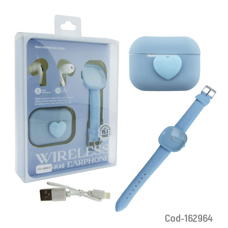 Audífono más reloj análogo modelo K46 para niños, disponible en variedad de colores. Combina entretenimiento y practicidad, ofreciendo sonido claro y cómodo para uso diario, junto con un reloj de diseño atractivo y fácil de usar, producto en blíster.