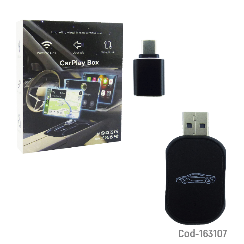 CarPlay inalámbrico para auto, permite conectar tu Smartwatch sin cables para acceder a mapas, música, llamadas y asistentes de voz. Ofrece conexión rápida y estable, con interfaz intuitiva y fácil instalación. Producto presentado en caja.