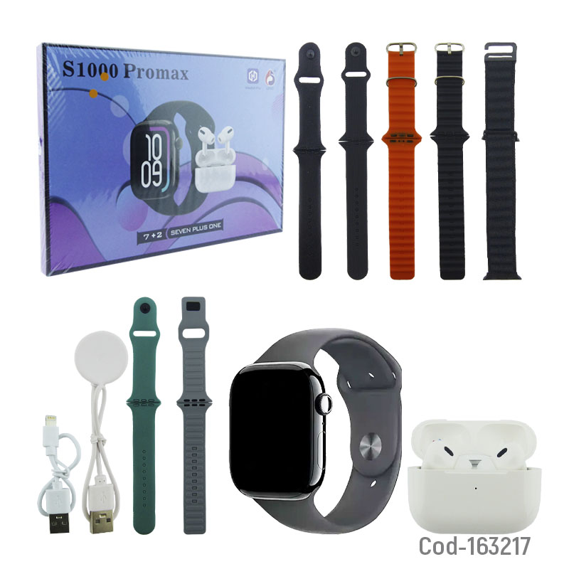 Reloj smartwatch modelo clásico S1000 PROMAX con audífonos bluetooth y kit de correas intercambiables, ideal para uso diario y deportivo. Ofrece funciones inteligentes de conectividad, monitoreo de salud, control de actividad y notificaciones en tiempo real, producto en caja.