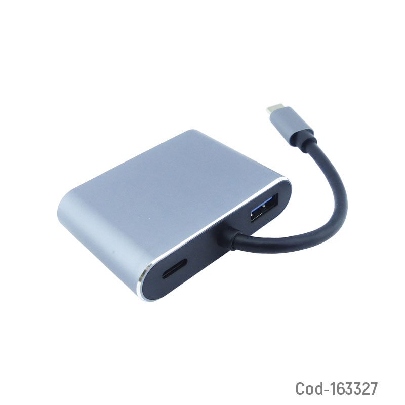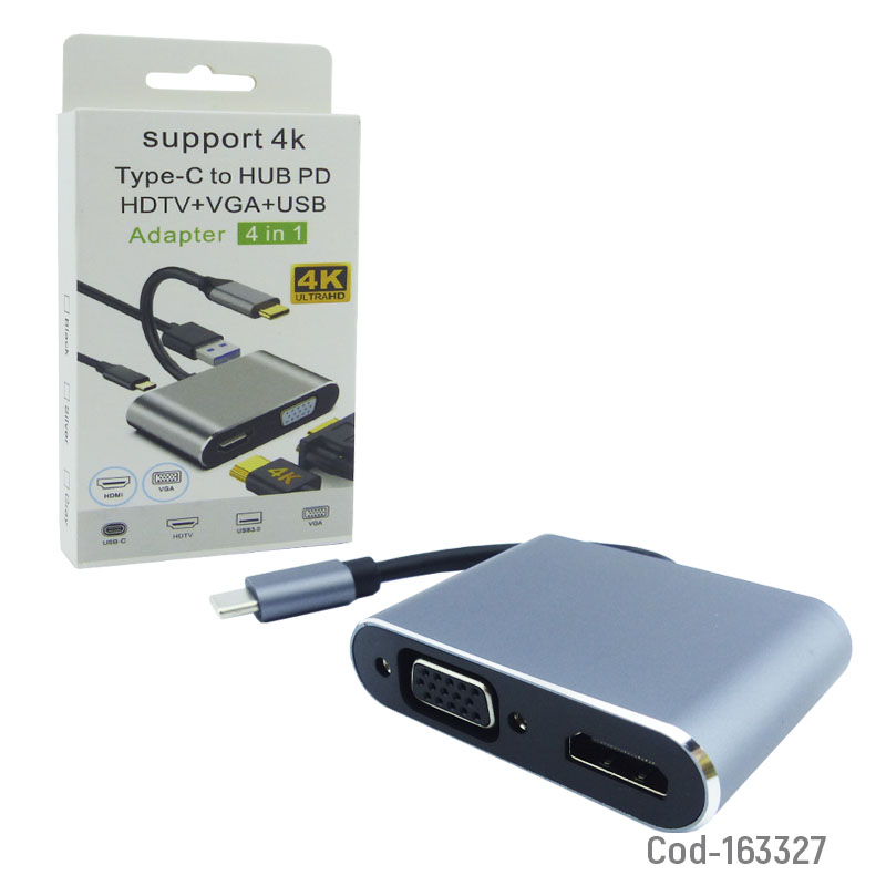 Convertidor cable Type-C 4 en 1 con puertos HDMI, VGA, USB y Type-C. Permite conectar múltiples dispositivos y transferir datos o video de manera eficiente, compatible con laptops, tabletas y smartphones, producto en caja.