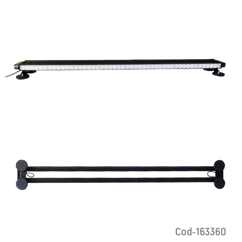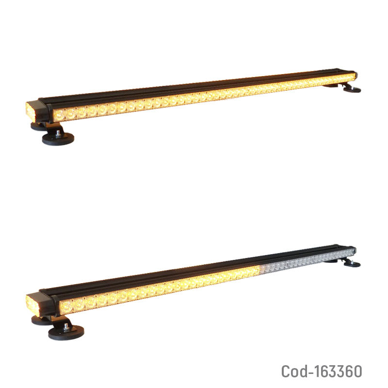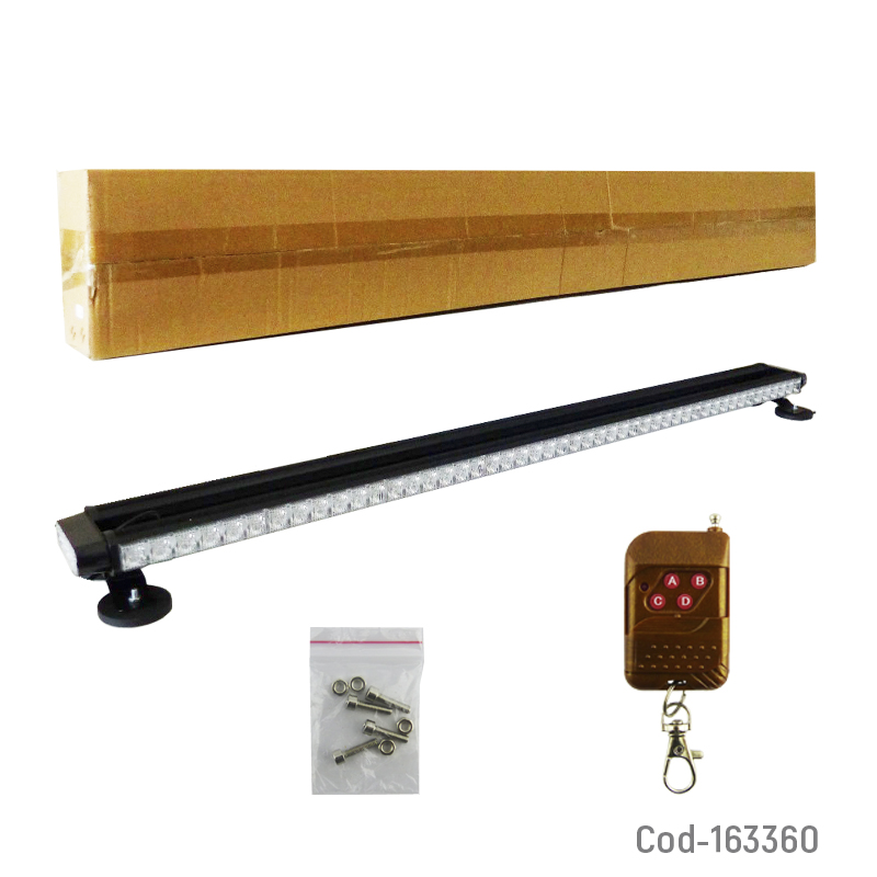 Baliza LED estrobo modelo barra de 1,20 metros, con luz ámbar intensa, doble sistema de anclaje y control remoto para fácil operación. Ideal para vehículos de emergencia o de trabajo, ofreciendo alta visibilidad y seguridad. Producto presentado en caja.