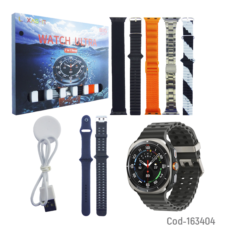 Reloj smartwatch modelo GALAXY de la marca KIT, diseñado para combinar funcionalidad y estilo. Incluye 7 correas intercambiables que permiten adaptarlo a diferentes ocasiones y gustos. Permite monitoreo de actividad física, notificaciones del celular y otras funciones inteligentes. Producto presentado en caja.