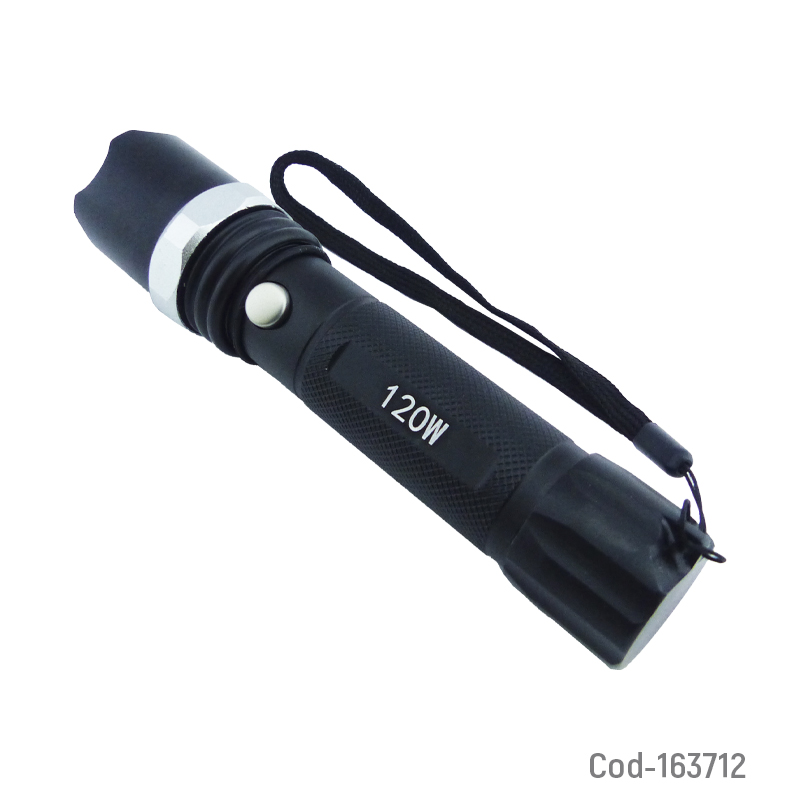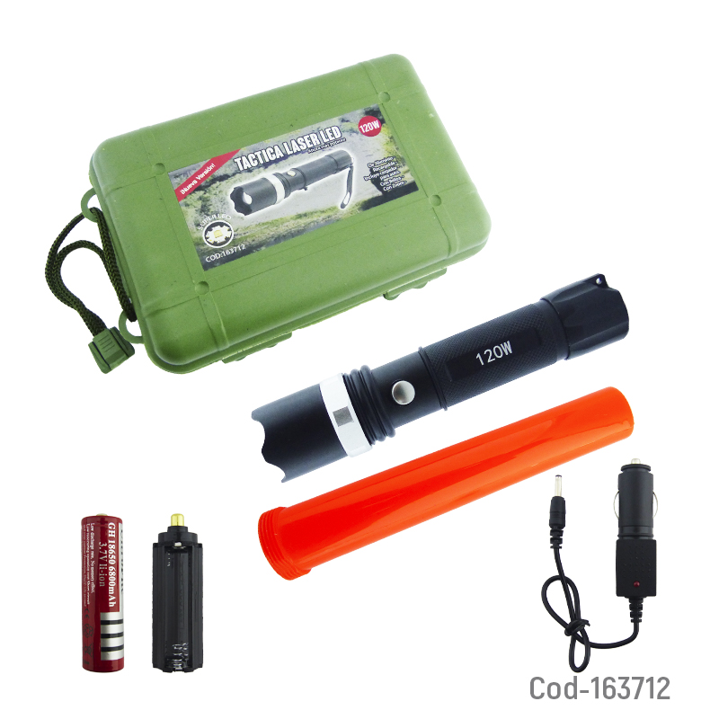 Linterna táctica LED láser de 120 W, con función Zoom y baliza, recargable. Funciona con pila y ofrece iluminación potente y ajustable, ideal para actividades al aire libre o seguridad. Producto presentado en estuche de PVC.