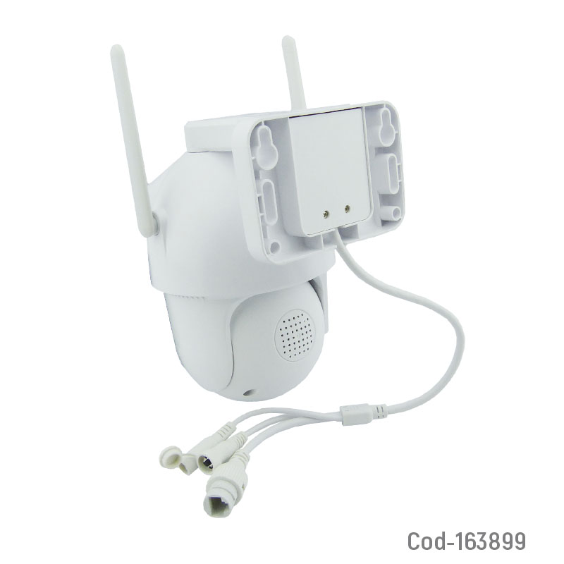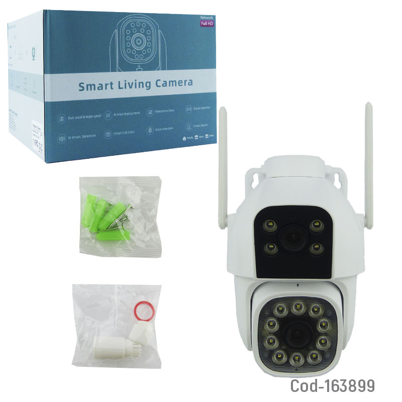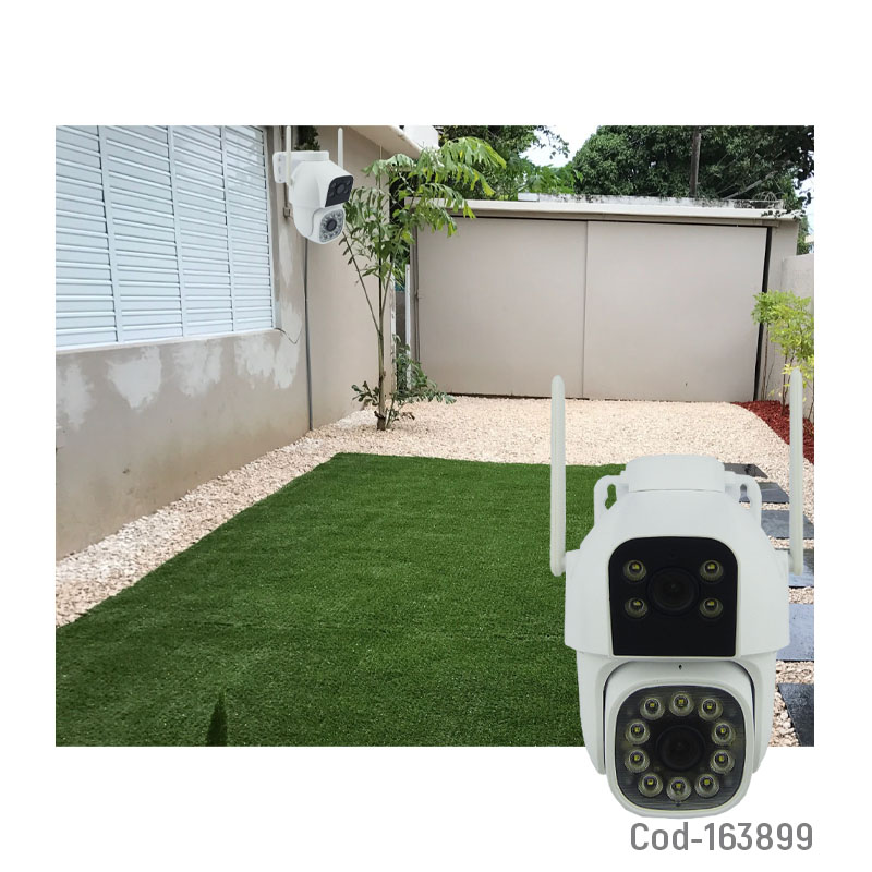 Cámara de vigilancia IP WiFi/LAN de doble lente, compatible con app YOSSE, con resolución 1980P Full HD. Ideal para monitoreo de interiores y exteriores, incluye funciones de detección de movimiento y visión nocturna, producto en caja.