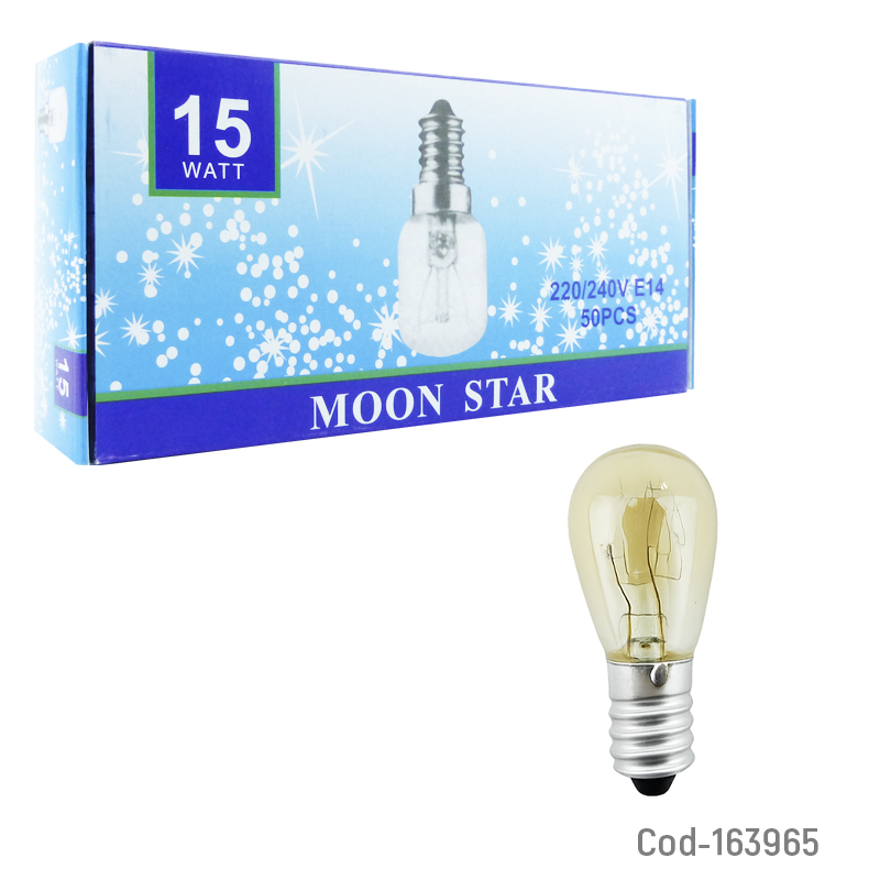 Ampolleta para refrigerador modelo E-14, marca MOON STAR, 15 watt, diseñada para iluminación eficiente y duradera en electrodomésticos. Fácil instalación y compatibilidad estándar. Producto en caja.