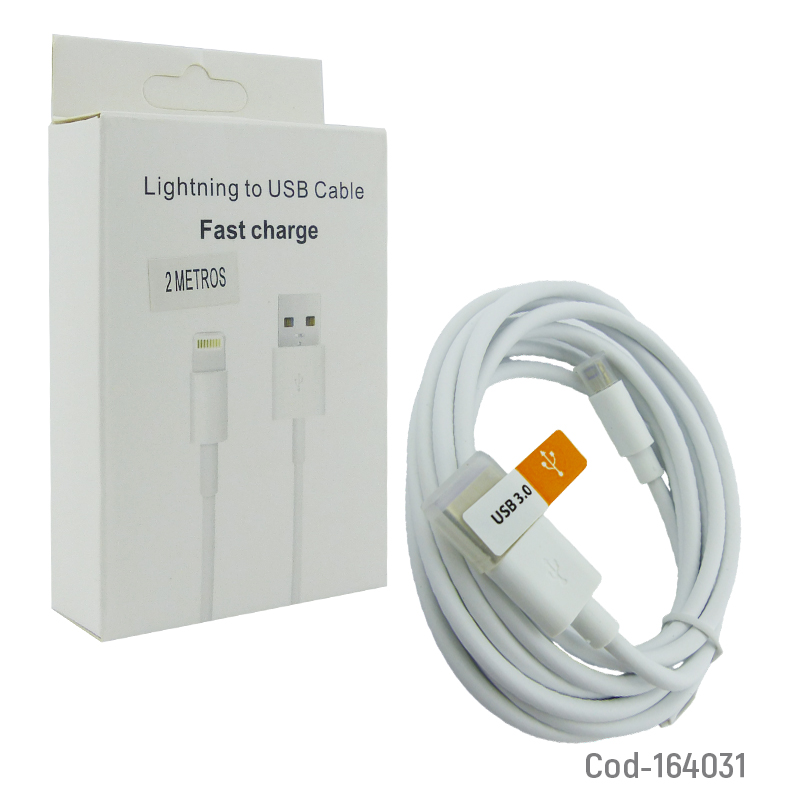 Cable para iPhone a USB de 2 mts, compatible con carga rápida y transferencia de datos. Duradero y flexible, ideal para uso diario. Producto en caja.