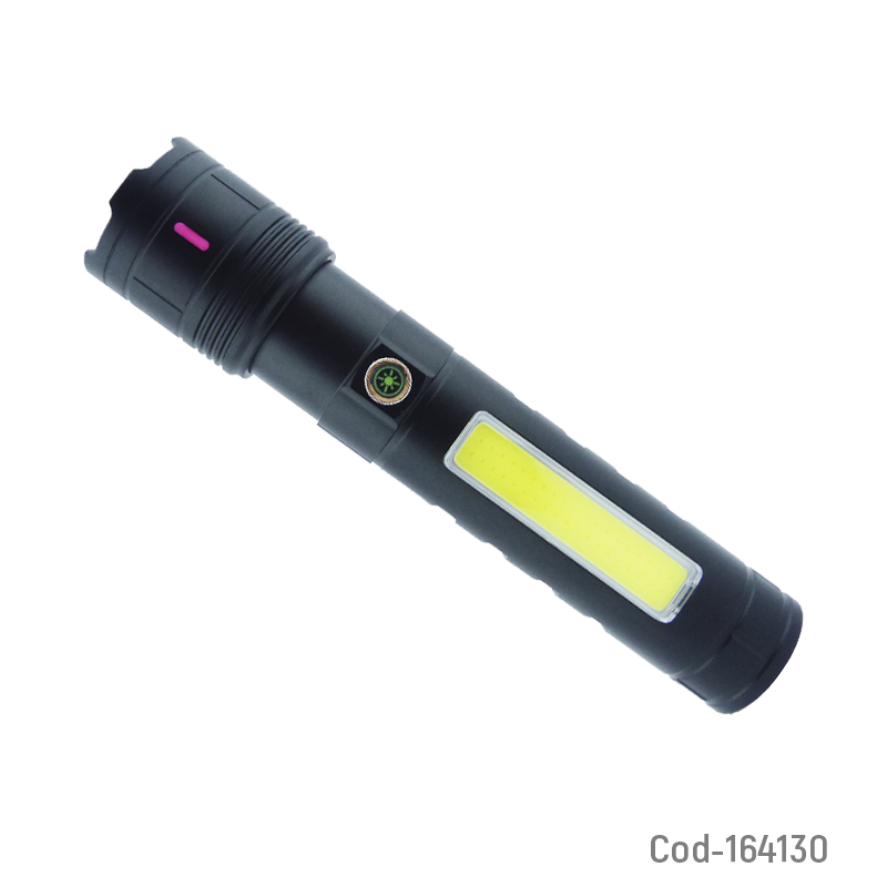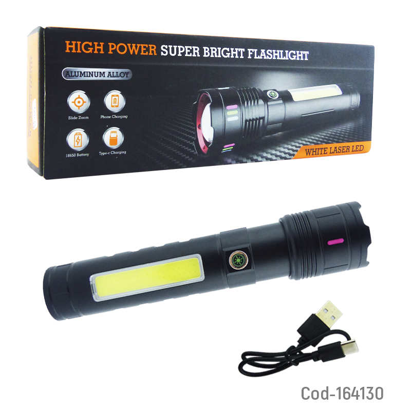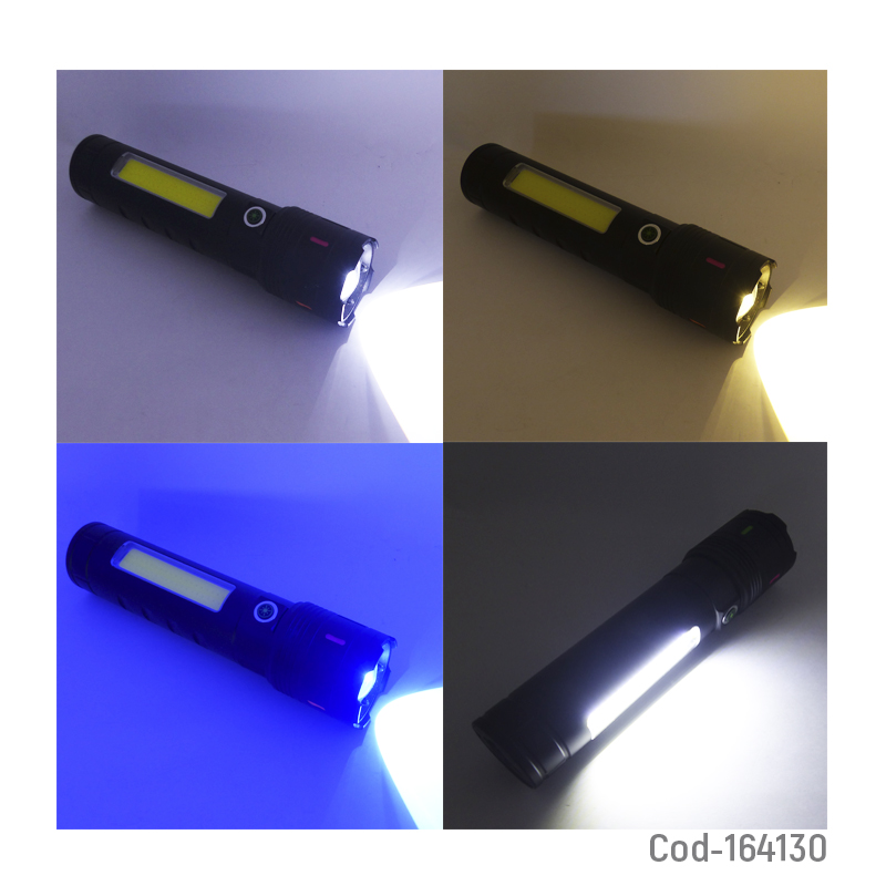 Linterna LED recargable de aluminio, compacta y resistente. Ofrece iluminación en 3 colores y alto brillo para uso diario o actividades al aire libre. Batería de larga duración y carga rápida. Producto en caja.