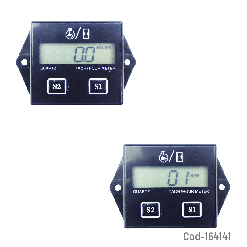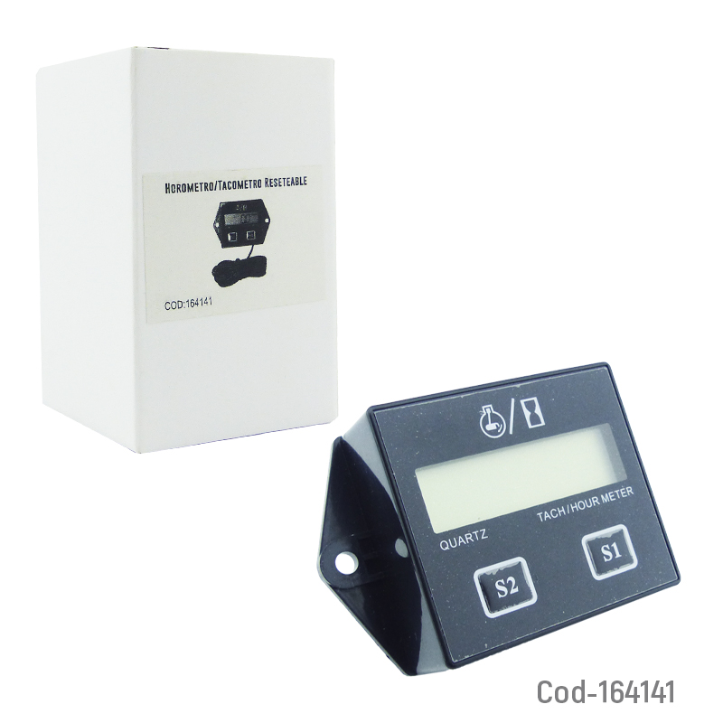 Horómetro y tacómetro digital para moto con pantalla LCD. Mide horas de uso y revoluciones en tiempo real. Fácil instalación, lectura clara y preciso para mantenimiento. Producto en caja.