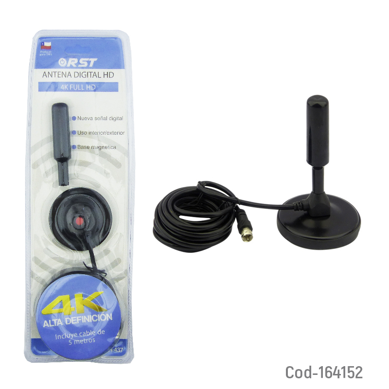 Antena de TV digital marca RST, cuenta con imán y cable de 5 metros, ideal para televisores Plasma, LCD y LED que tengan sintonizador digital. Solo basta con fijar la antena en una superficie metálica, bien sea en el interior o exterior.