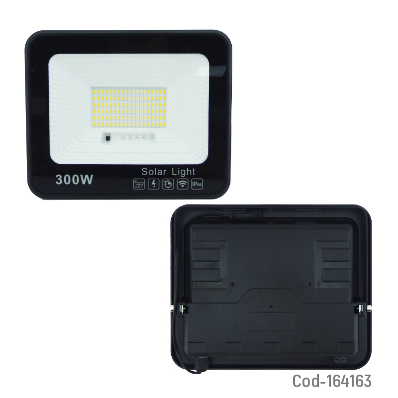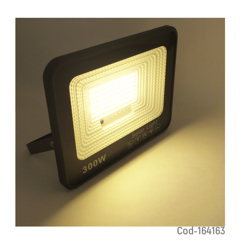 Proyector solar LED de 300 Watt, equipado con 108 LED de luz cálida, panel solar para carga eficiente y control remoto para mayor comodidad. Ideal para iluminación exterior. Producto en caja.