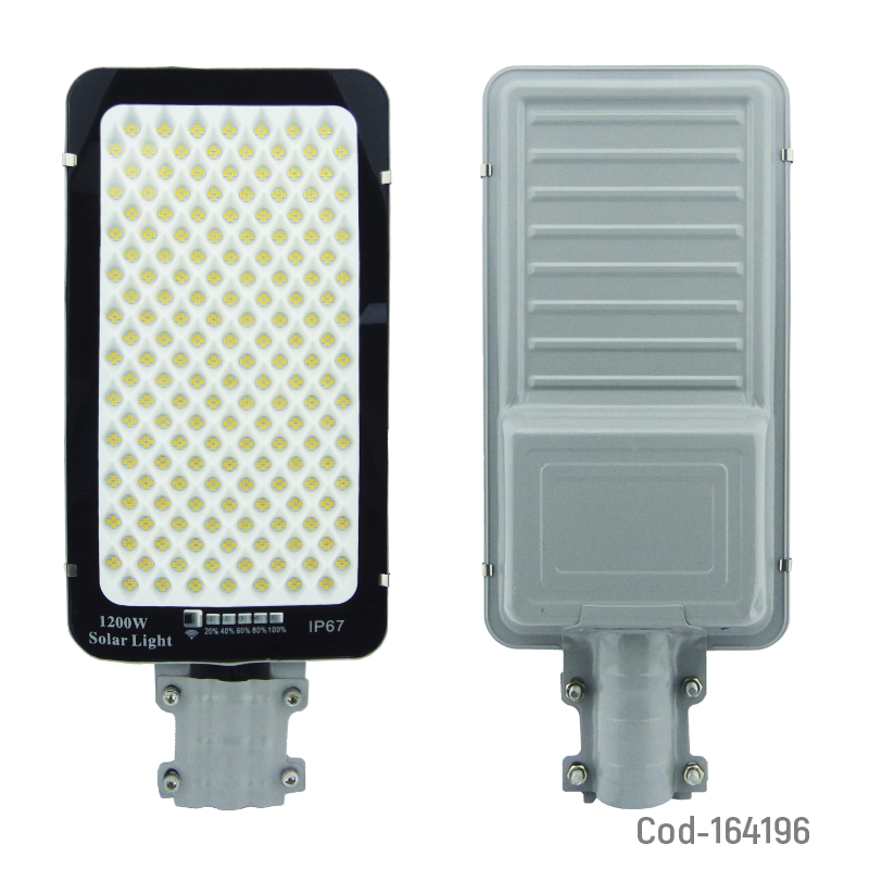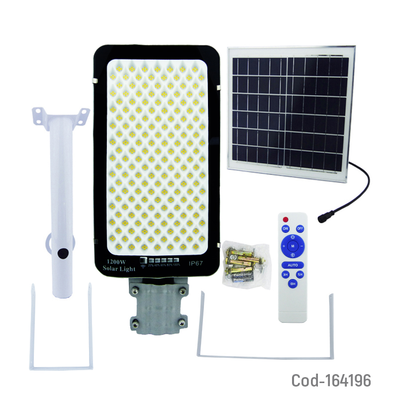 Foco con brazo solar de luz calida a 1200 watt. Incluye panel solar, control remoto y 688 LED de alta potencia. Ideal para patios, exteriores, estacionamientos y seguridad. Producto en caja.