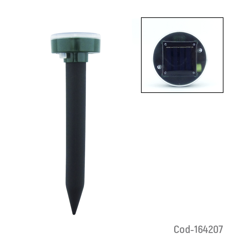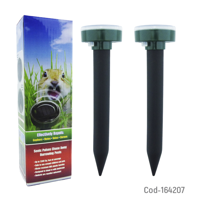 Estaca solar repelente de roedores y conejos, set de 2 unidades, funciona con energía solar y emite vibraciones para ahuyentar plagas sin químicos. Ideal para jardines y áreas verdes. Producto en caja.
