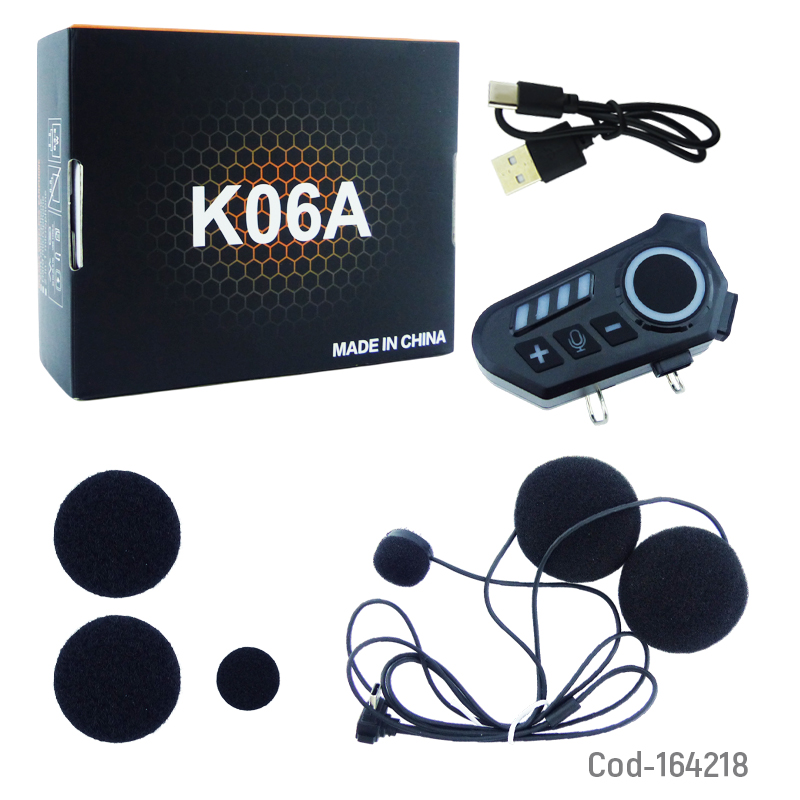 Bluetooth para casco modelo K06A, estéreo permite realizar y recibir llamadas, escuchar música y seguir indicaciones GPS sin soltar el manubrio. Cuenta con conexión bluetooth estable, micrófono y controles de fácil acceso. Diseño compacto y resistente para uso en moto. Producto de alta calidad, presentado en caja.