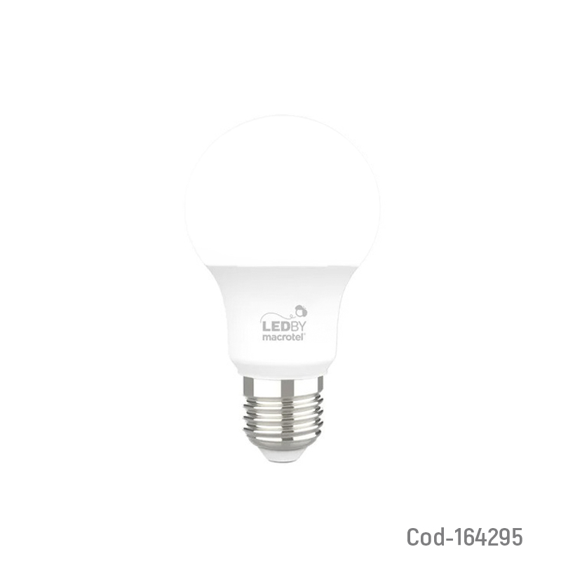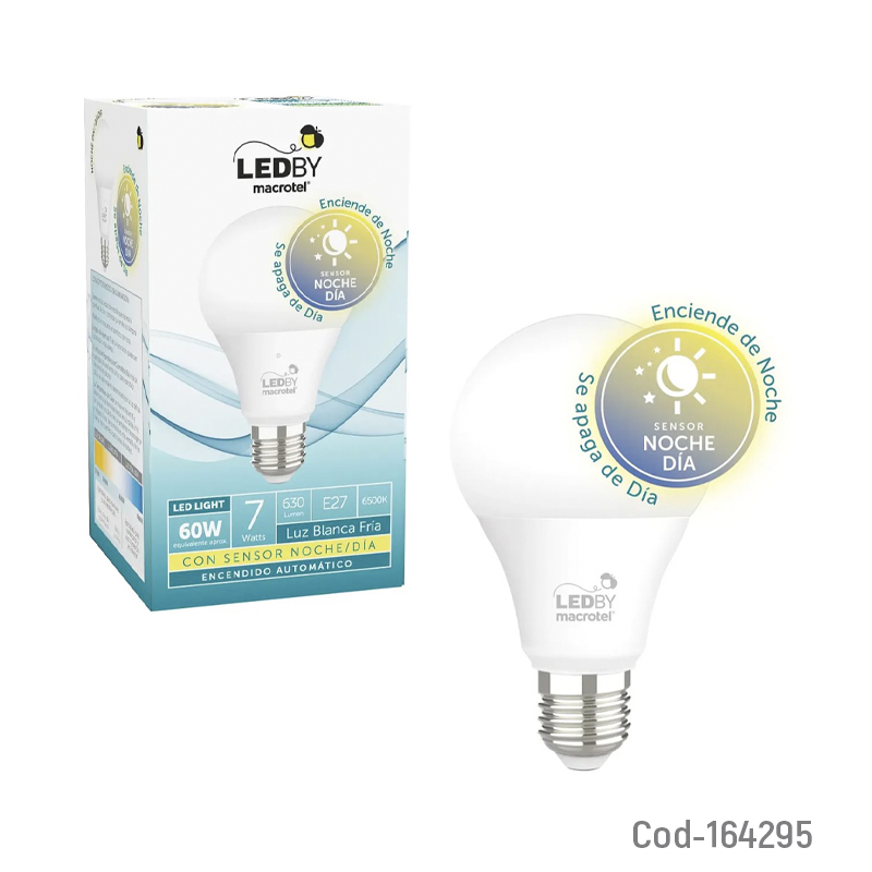 Ampolleta LED BY MACROTEL modelo E27 de 7 watt con sensor día/noche, luz fría 6500K. Ofrece ahorro de energía y larga duración. Producto en caja.