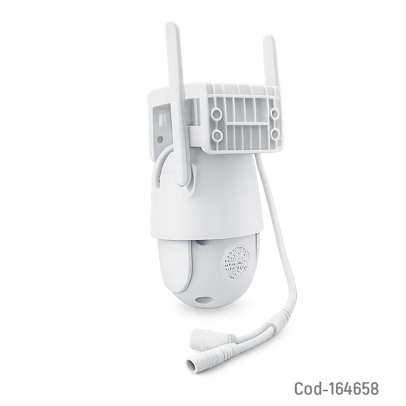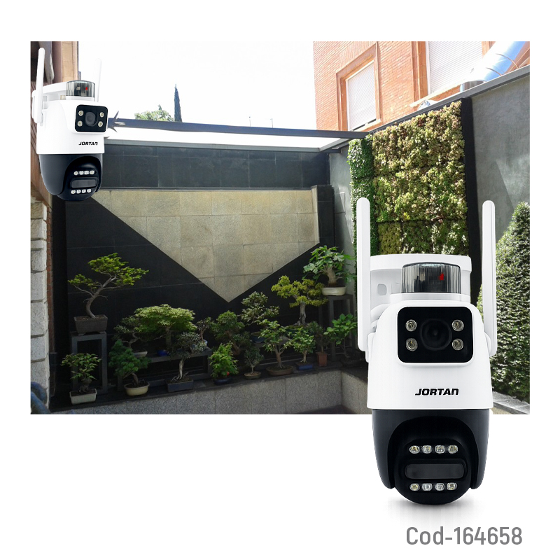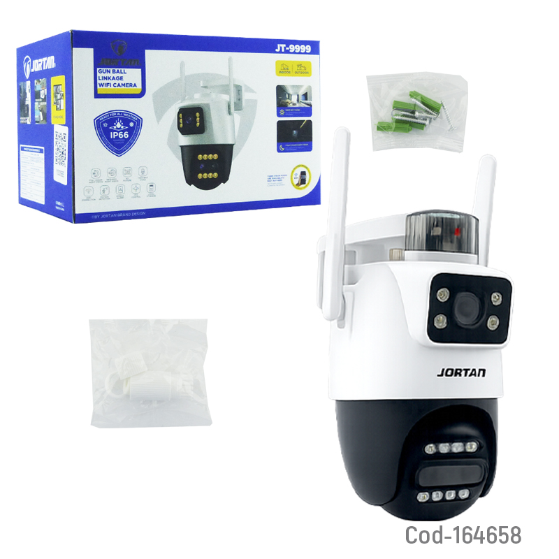 Cámara de vigilancia IP Wifi doble cámara con Zoom marca JORTAN. Cuenta con 14 LED y resolución de 3 MP. Compatible con app YOOSE. Ideal para seguridad en hogares y negocios. Producto en caja.