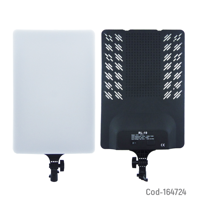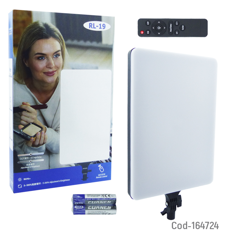 Panel LED para fotografía modelo RL-19, con 3 tonos de luz ajustables y control remoto para fácil manejo de la iluminación. Ideal para fotografía, video y grabaciones. Producto en caja.