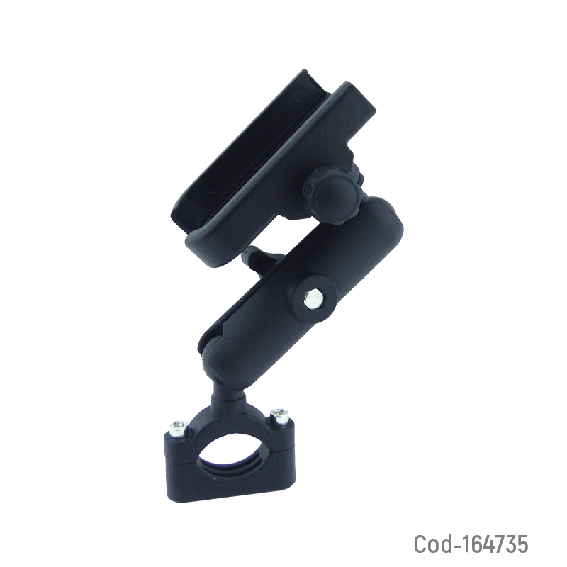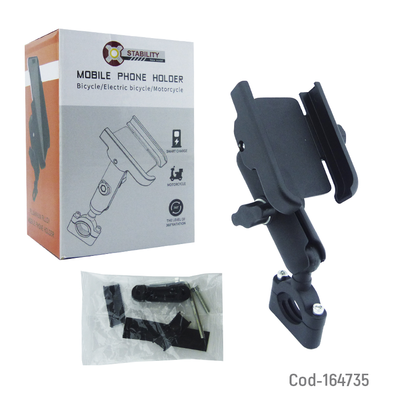 Porta smartphone de metal modelo B-640, para manubrio de moto o bicicleta, con brazo articulado que permite ajustar el ángulo de visión. Firme y resistente. Producto de alta calidad en caja.