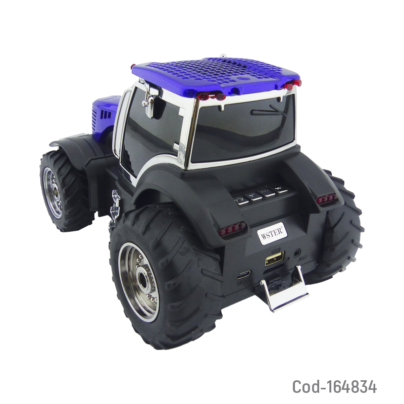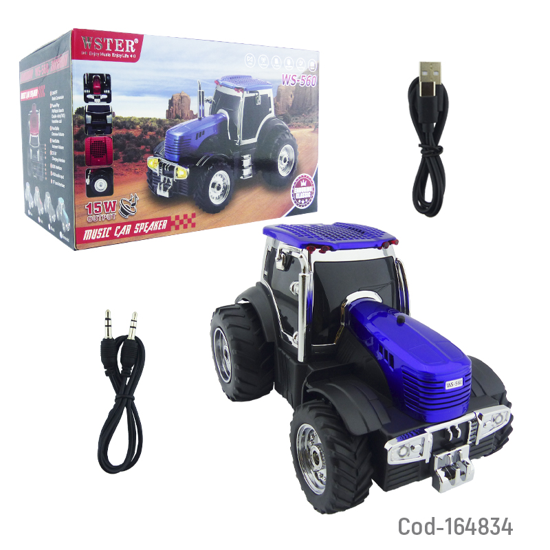 Parlante recargable modelo WS-560 con diseño de tractor. Conexión Bluetooth, puerto USB y radio FM. Potencia de 15 watt, sonido claro y batería recargable. Disponible en variedad de colores. Producto en caja.
