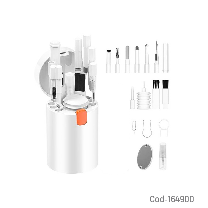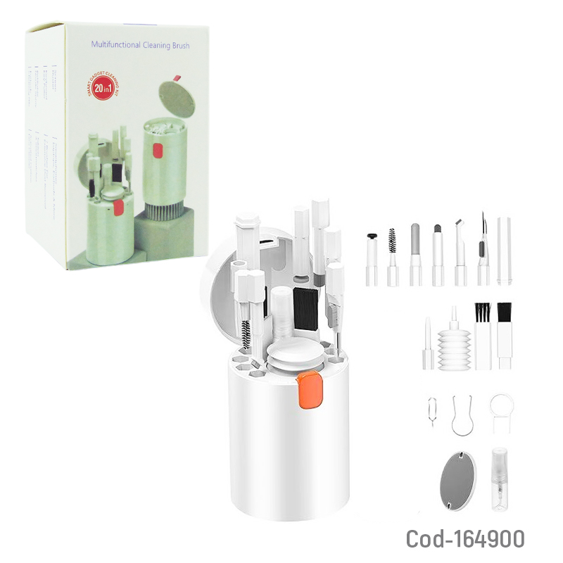 Kit de limpieza 20 en 1, ideal para la limpieza completa de dispositivos electrónicos. Incluye múltiples herramientas para audífonos, teclados, pantallas y puertos. Producto presentado en caja, práctico y fácil de transportar.