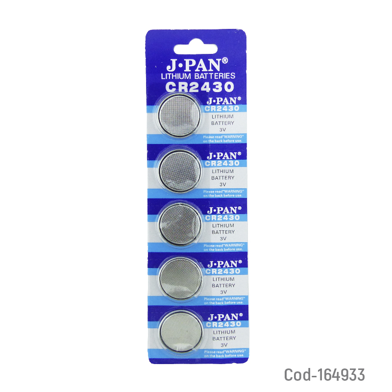Pila marca J.PAN modelo CR2430, set por 5 unidades, 3 volt Lithium, alto rendimiento y larga duración para dispositivos electrónicos. Producto en blíster.