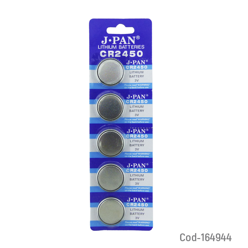 Pila marca J.PAN modelo CR2450, set por 5 unidades, 3 volt de litio, alto rendimiento y larga duración para dispositivos electrónicos. Producto en blíster.