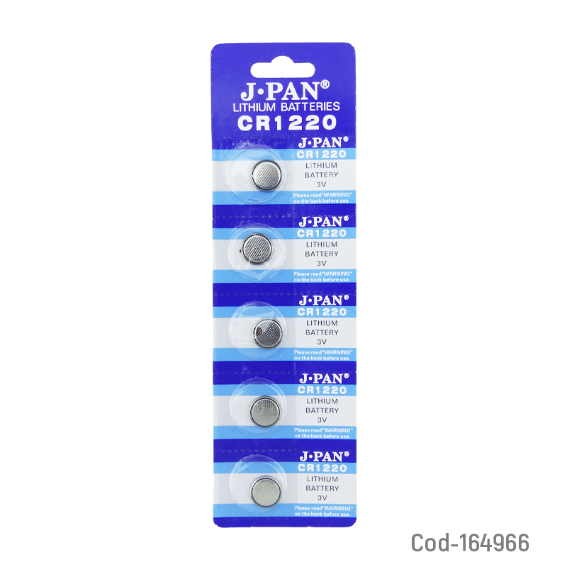 Pila J.PAN CR1220 3V Lithium, set de 5 unidades. Ideal para controles, relojes y dispositivos electrónicos. Presentación en blíster.