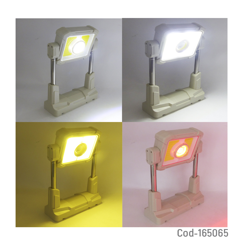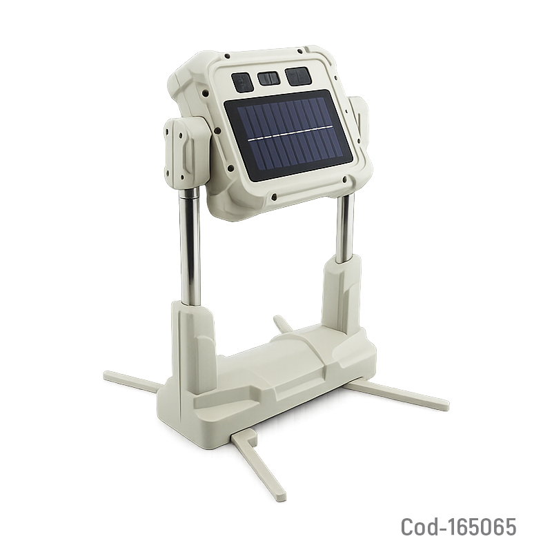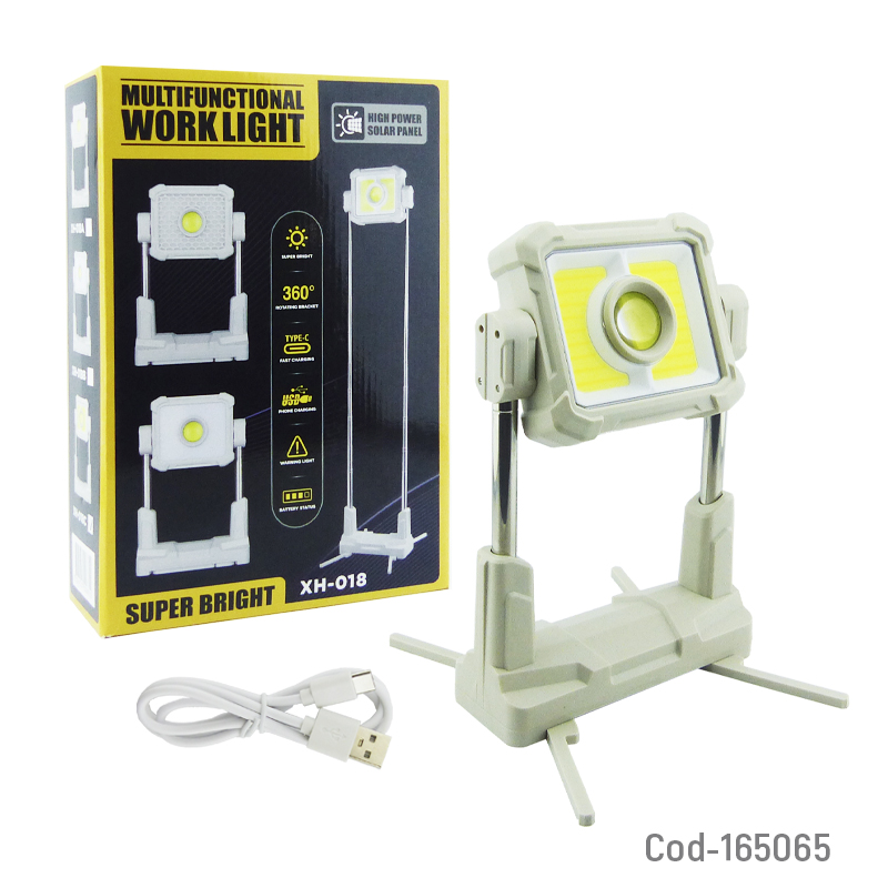 Proyector solar LED portátil modelo HX-018C, con estructura extensible hasta 1,70 m, varios tonos de luz seleccionables y batería recargable. Diseñado para uso exterior, camping o trabajos, ofrece iluminación práctica y estable. Producto en caja.