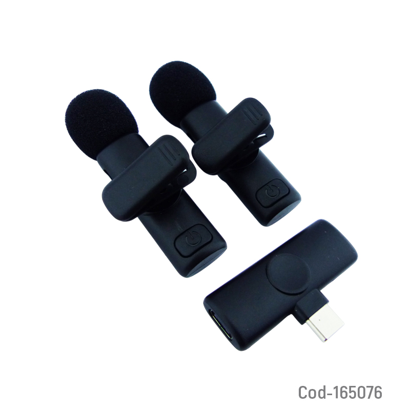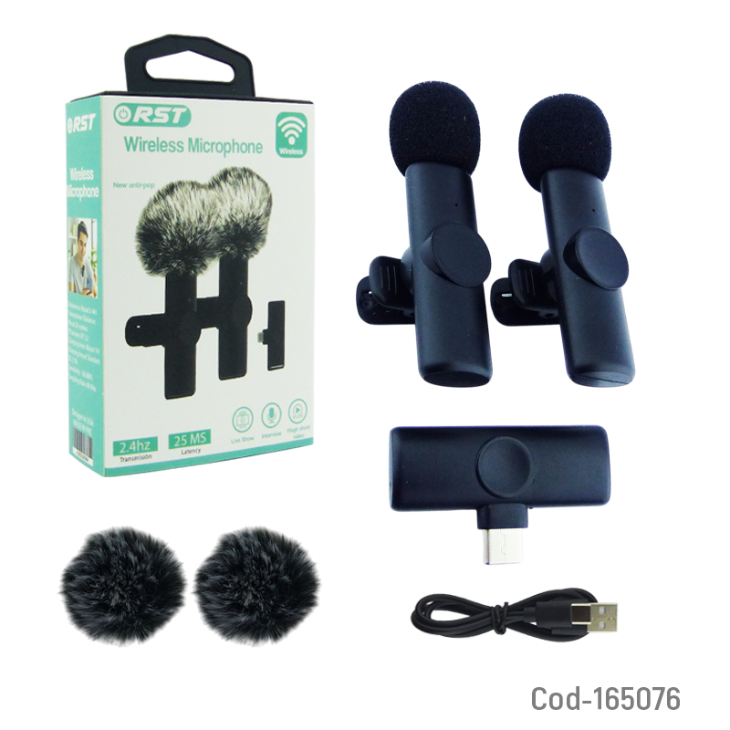 Micrófono inalámbrico para smartphone marca RST, set x2 con conexión Type-C. Incluye protectores de viento. Ideal para grabaciones, videos y transmisiones en vivo. Producto presentado en caja.