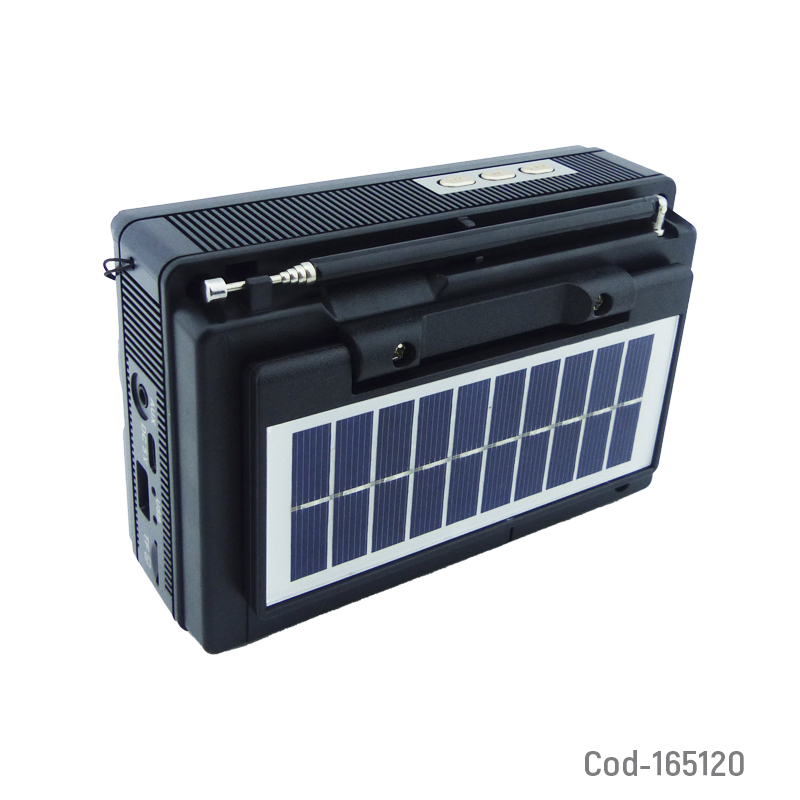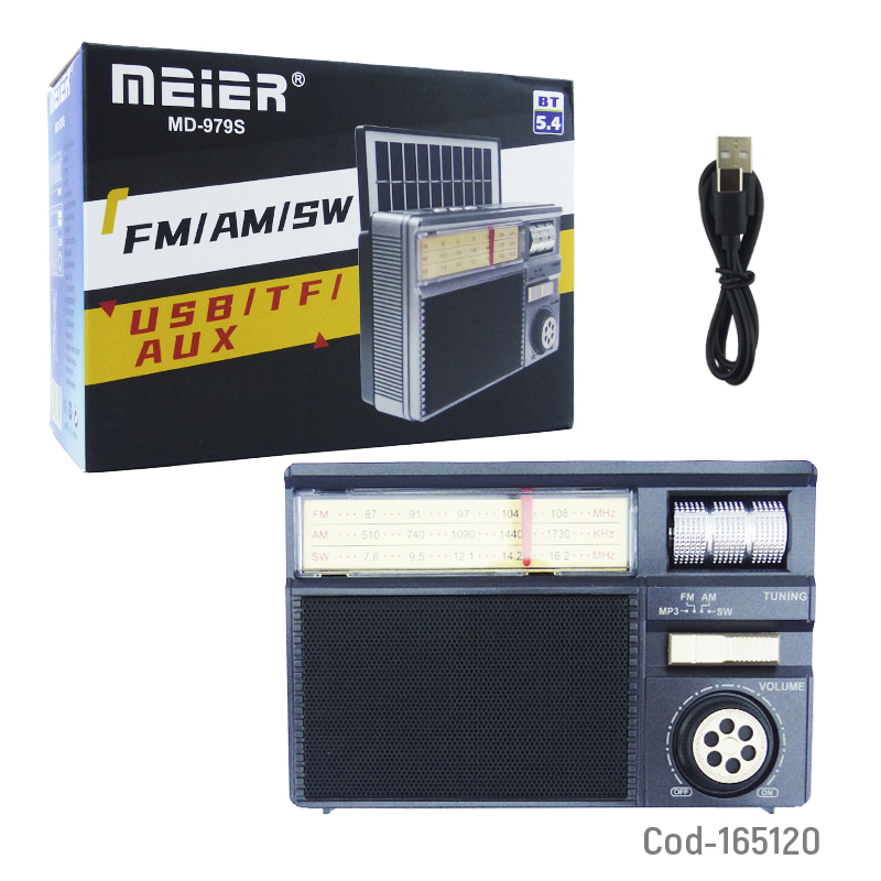 Radio multibanda solar MEIER modelo MD-979S, recargable, con conexión Bluetooth, FM, AUX, USB y TF. Funciona con energía solar, ideal para emergencias, camping y uso diario. Diseño portátil, buen sonido y fácil de usar. Producto en caja.